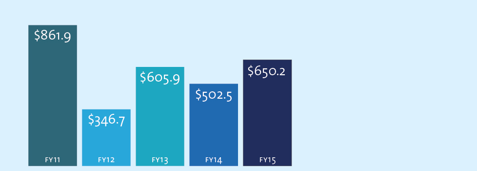 In fiscal year 2014–2015, donors to Yale contributed an extraordinary $650.2 million in new gifts and pledges, the second largest total in Yale’s history. Alumni, parents, and friends were generous in their support, providing new resources for all areas of the university.
