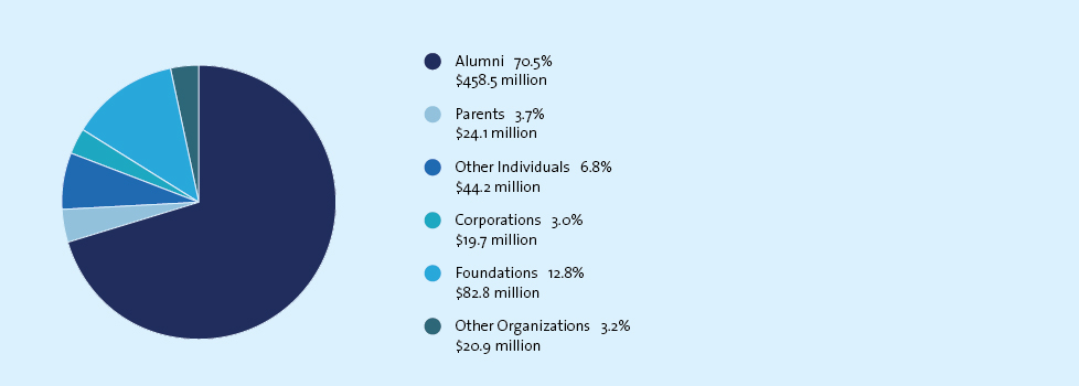 Individual donors, including alumni, parents, and friends, provided 81 percent of the giving total. Corporations and foundations provided another 16 percent.